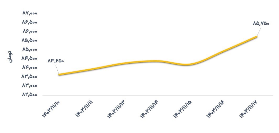 در این هفته دلار آزاد در محدوده 85,750- 83,650 تومان معامله شد و با رشد 2/5 درصدی به قیمت 85,750 تومان در انتهای هفته رسید. ابهامات سیاسی به تقویت تقاضا و افزایش قیمت دلار آزاد منجر شد.