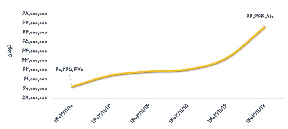 در این هفته قیمت سکه امامی در محدوده 66,644,810- 60,265,470 تومان معامله شد و در پایان هفته با افزایش 10/6 درصدی به قیمت 66,644,810 تومان رسید. برآیند مثبت بازده نرخ دلار در بازار آزاد و قیمت انس جهانی به افزایش قیمت سکه امامی منجر شد.