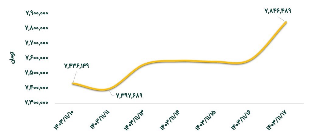در این هفته هر گرم شمش طلا در محدوده 7,846,489-7,397,689 تومان معامله شد و در پایان هفته با افزایش 5/5 درصدی به قیمت 7,846,489 تومان رسید.