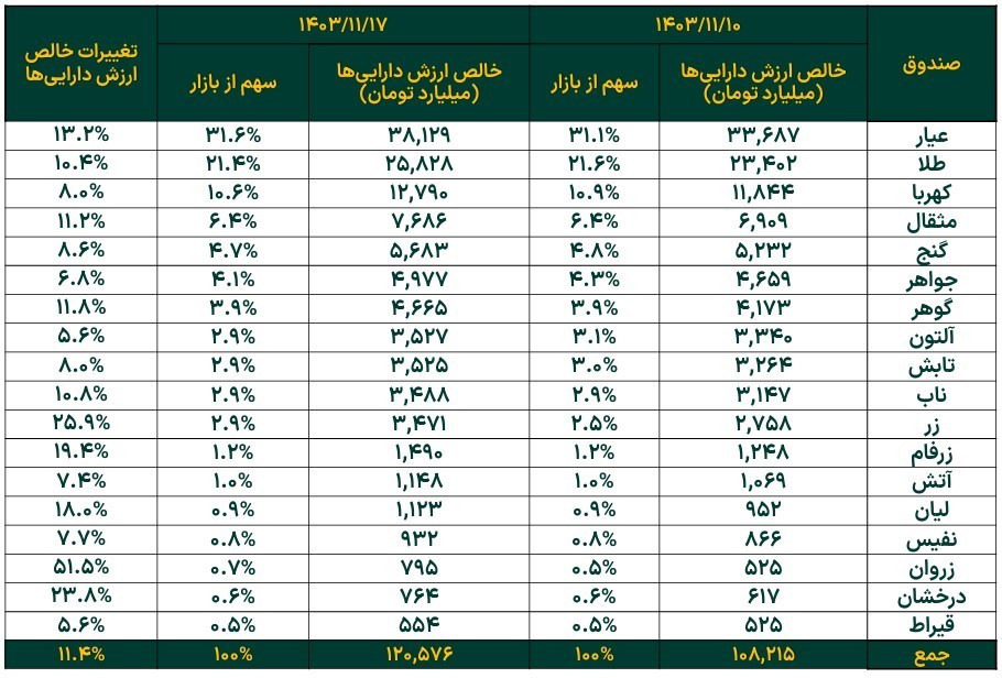 خالص ارزش دارایی صندوقهای طلا در تاریخ 1403/11/17 بالغ بر 120/5 همت بود که نسبت به هفته گذشته 11/4 درصد افزایش یافت.