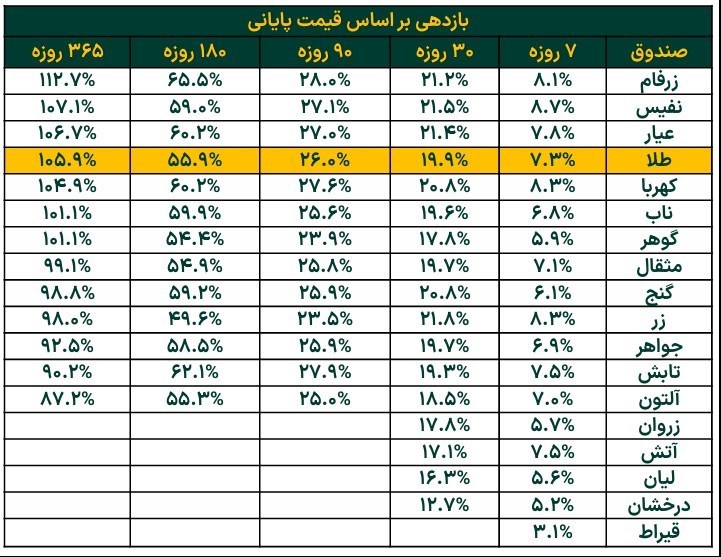 در جدول زیر بازدهی صندوقهای طلا بر اساس قیمت پایانی در بازههای زمانی مختلف منتهی به تاریخ 1403/11/17 ارائه شده است. (رتبهبندی بر اساس 365 روزه)