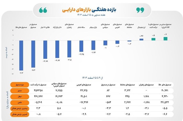 بر اساس این گزارش، صندوقهای مبتنی بر کالا (انرژی) با کسب 0.7 درصد بازده هفتگی، به عنوان پربازدهترین بازار دارایی در میان تمام کلاسهای دارایی موجود بورسی و غیر بورسی به ثبت رسیدند.