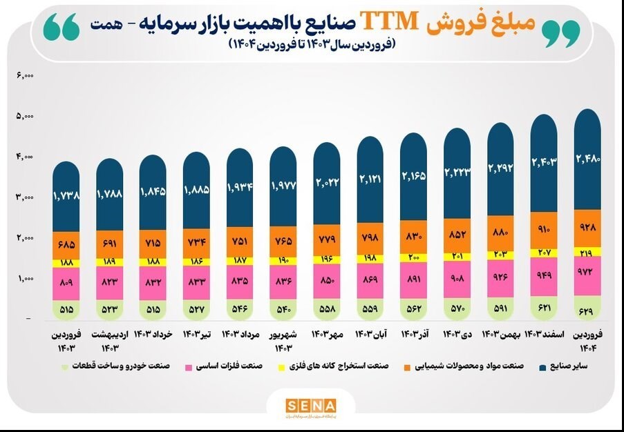 افزون براین، مبلغ فروش سایر صنایع نسبت در فروردین امسال نسبت به فروردین پارسال رشد 43 درصدی داشته؛ بهطوری که از 1،738 به 2،480 همت در بازه زمانی یکسال گذشته رسیده است.