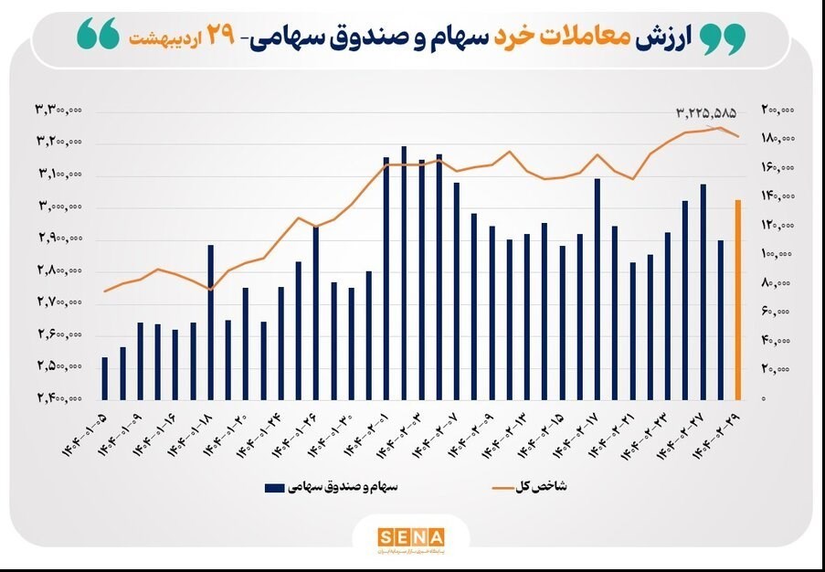 عصر بازار- دادههای آماری مدیریت نظارت بر بورسهای سازمان بورس و اوراق بهادار حاکی از آن است که در معاملات امروز دوشنبه بازار سهام، ارزش معاملات خرد، شامل: «مبادلات سهام و صندوقهای سهامی»، به مرز ۱۴همت رسید.