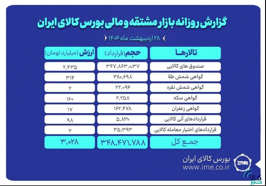 عصر بازار- روز گذشته در بازار مشتقه و مالی بورس کالای ایران در مجموع حدود ۳۴۸ میلیون و ۴۷۲ هزار قرارداد به ارزش ۳ هزار و ۲۸ میلیارد تومان منعقد شد.