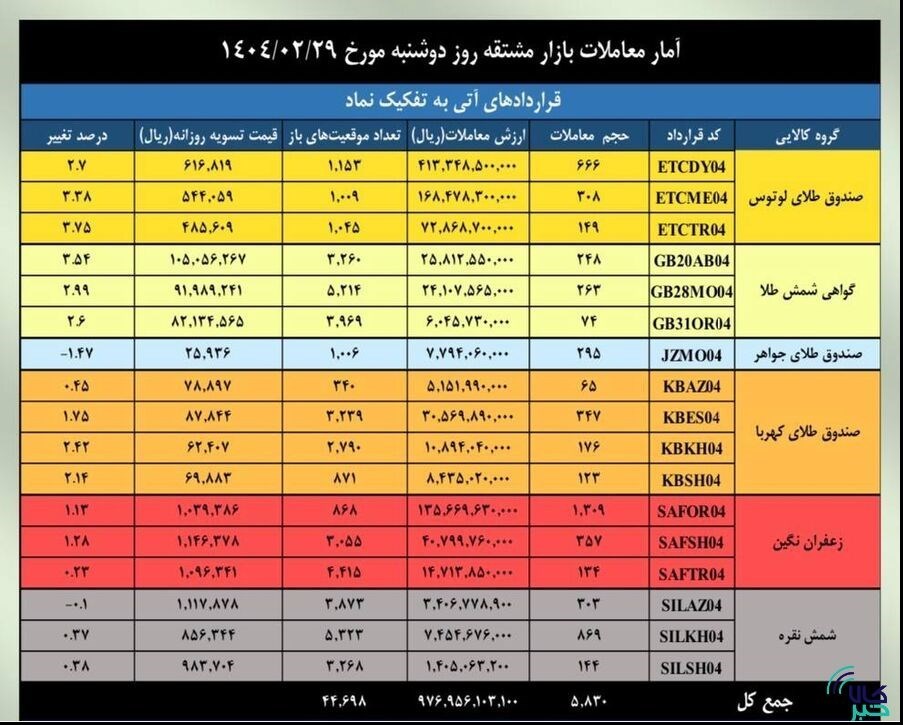 در دادوستدهای روز گذشته بازار قراردادهای آتی، 5 هزار و 830 قرارداد آتی به ارزش 98 میلیارد تومان منعقد شد. روز گذشته بیشترین حجم معاملات به قراردادهای آتی زعفران نگین اختصاص داشت. بیشترین ارزش معاملات نیز، متعلق به نماد لوتوس بود که در مجموع تمام قراردادهای آتی این نماد به حدود 65.5 میلیارد تومان رسید.