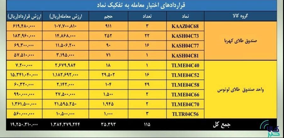 در در دادوستدهای روز گذشته 35 هزار و 393 قرارداد اختیار معامله به ارزش 2 میلیارد تومان منعقد شد. بیشترین ارزش معاملات در قراردادهای اختیار معامله به صندوق طلای لوتوس اختصاص یافت به طوری که حجم معاملات تمام قراردادهای اختیار معامله صندوق طلای لوتوس 34،069 قرارداد بود.