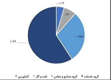 بخش خدمات با ثبت رشد 3.4 درصدی، تنها عامل مثبت در ترکیب رشد اقتصادی فروردین بوده است. زیربخشهایی مانند «خردهفروشی و عمدهفروشی»، «اداره امور عمومی، دفاع و خدمات اجتماعی» و «املاک و مستغلات» از جمله حوزههایی بودهاند که رشد مثبت ثبت کردهاند. این گروه بزرگترین نقش مثبت را در رشد اقتصادی فروردین با سهم 1.72 واحد درصد ایفا کرده است.