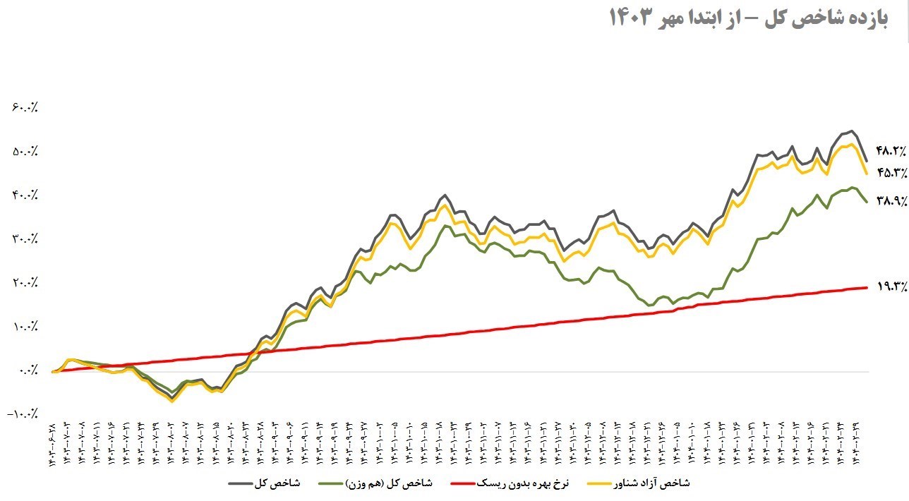 به گزارش پایگاه خبری «عصر بازار» به نقل از سنا، معاون نظارت بر نهادهای مالی سازمان بورس و اوراق بهادار، با اشاره به روند نمودارهای شاخص کل و شاخص هم‌وزن در 9 ماه گذشته، توضیح داد: در این دوره بازده شاخص هم‌وزن، که با نمودار سبز رنگ مشخص شده، به شاخص کل نزدیک بوده است.