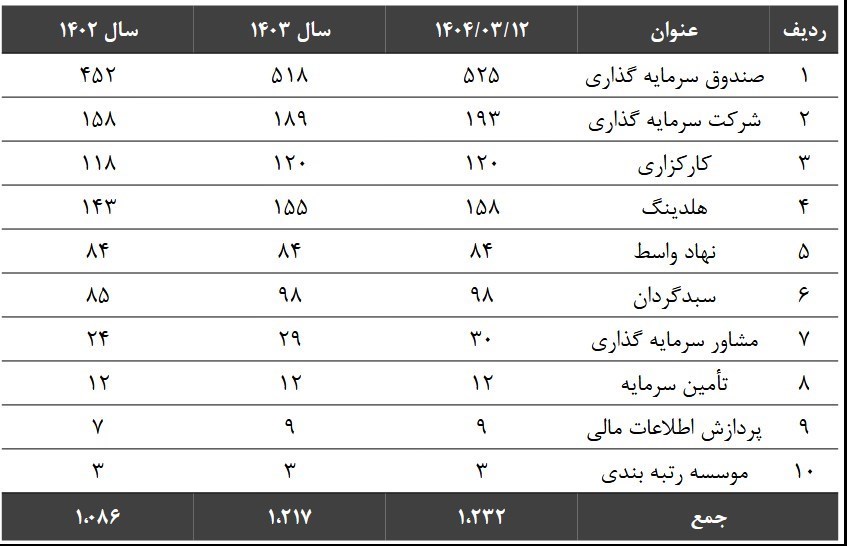 معاون نظارت بر نهادهای مالی سازمان بورس و اوراق بهادار، اعلام کرد: تعداد نهادهای مالی فعال در بازار سرمایه به 1232 نهاد رسیده است که شامل؛ 525 صندوق سرمایه‌گذاری، 193 شرکت سرمایه‌گذاری، 120 شرکت کارگزاری، 98 شرکت سبدگردان، 12 شرکت تأمین سرمایه و 30 شرکت مشاوره سرمایه‌گذاری می‌شود. در سال‌های اخیر، شاهد رشد چشمگیر حجم صندوق‌های سرمایه‌گذاری بوده‌ایم. منابع تجهیز شده این صندوق‌ها اکنون به حدود 1400 هزار میلیارد تومان رسیده است. این عدد در گذشته حدود 100 هزار میلیارد تومان بود. این رشد در صندوق‌های درآمد ثابت 33 درصد، در صندوق‌های سهامی 18 درصد و در صندوق‌های کالایی 44 درصد بوده است.