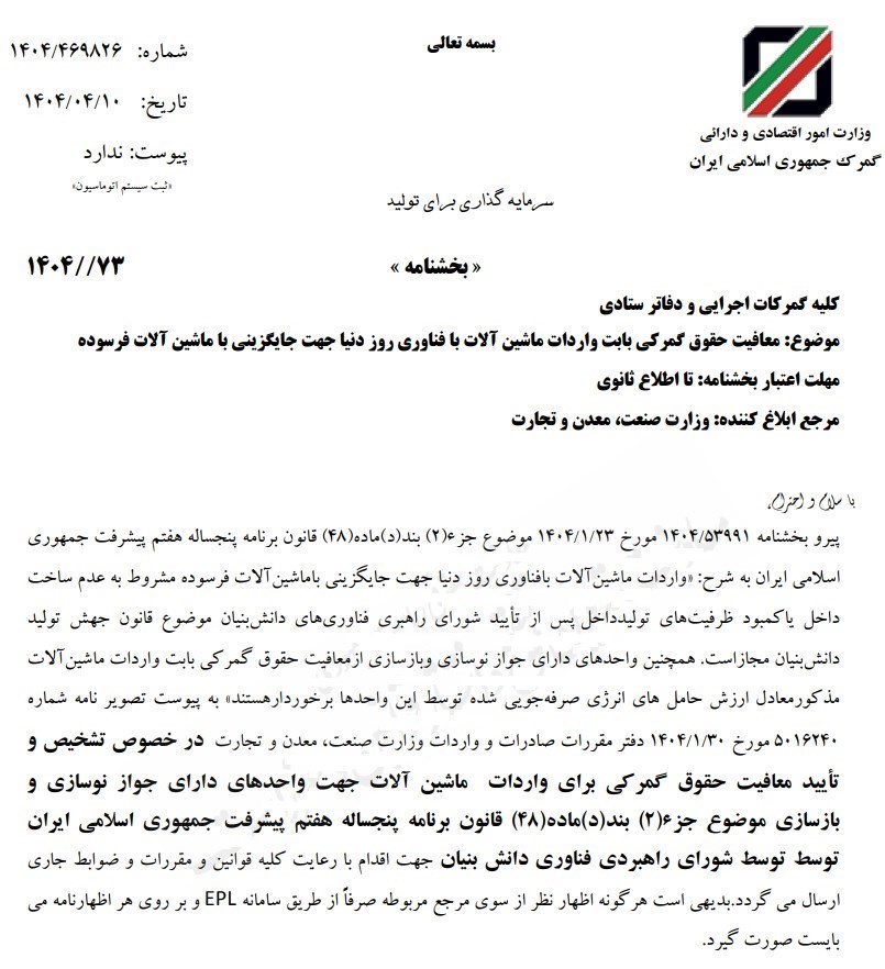 این بخشنامه مطابق جزء ٢ بند «د» ماده ٤٨ قانون برنامه پنج ساله هفتم پیشرفت صادر شده که بر اساس آن «واردات ماشین‌آلات بافناوری روز دنیا جهت جایگزینی باماشین‌آلات فرسوده مشروط به عدم ساخت داخل یا کمبود ظرفیت‌های تولید داخل پس از تأیید شورای راهبری فناوری‌های دانش‌بنیان موضوع قانون جهش تولید دانش‌بنیان مجاز است.»