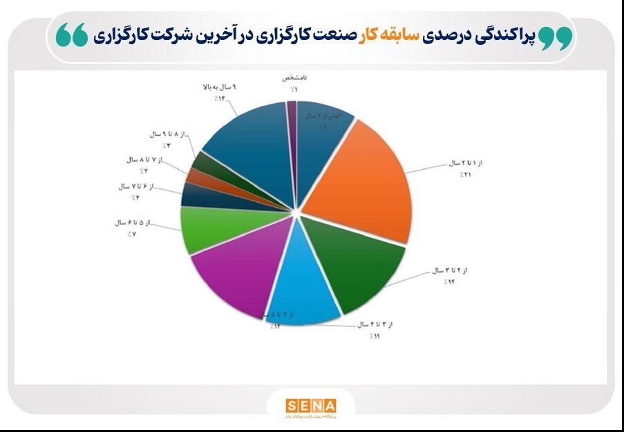 هم چنین، 21 درصد پرسنل این صنعت سابقه یک تا 2 سال، 14 درصد سابقه 9 سال به بالا، 14 درصد سابقه 2 تا 3 سال، 14 درصد سابقه 4 تا 5 سال و 11 درصد سابقه 3 تا 4 سال دارند.