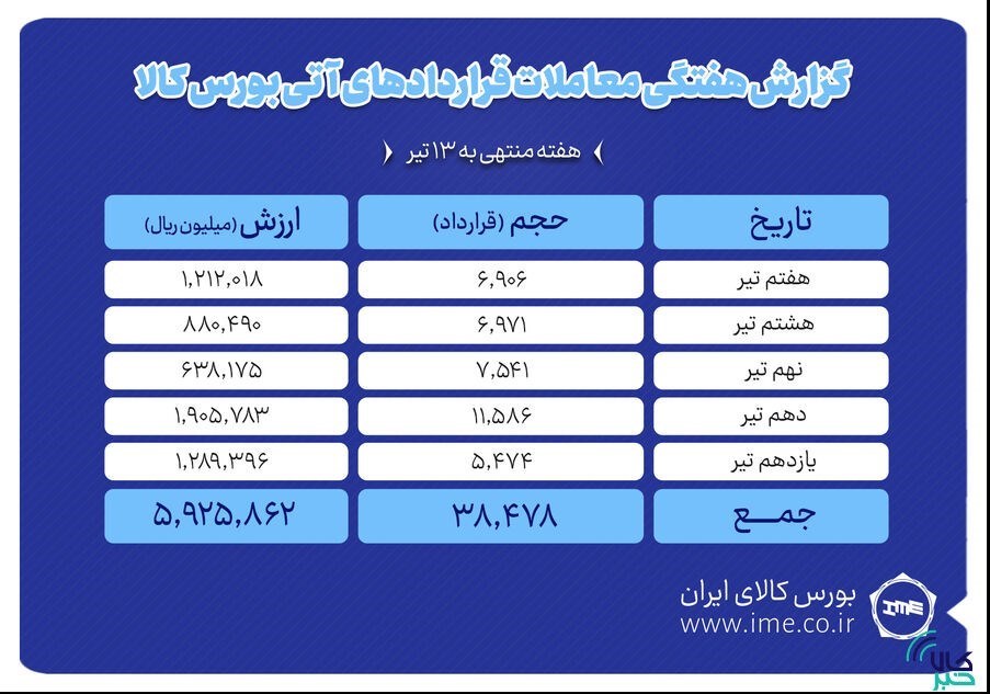عصر بازار- بررسی روند معاملات قراردادهای آتی بورس کالای ایران درهفته منتهی به ۱۳ تیر ماه نشان می دهد که در هفته گذشته ارزش معاملات بازار آتی به بیش از ۵۹۲ میلیارد تومان رسید.