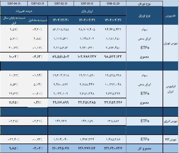 همچنین طی مدت مذکور (پایان خردادماه 1404) ارزش بورس انرژی ایران به 13.8 همت رسید که بیانگر کاهش 2.3 درصدی نسبت پایان سال قبل است. از سوی دیگر بورس کالای ایران در پایان خردادماه سال جاری با افت 22 درصدی نسبت به اسفند ماه سال قبل به 148 همت رسید.