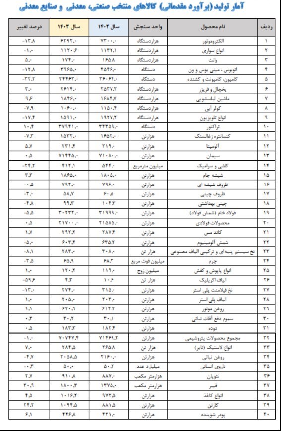 گفتنی است بر اساس پینوشت این گزارش، این آمار تولید قطعی نبوده و هیچ الزام قانونی برای واحدهای تولیدی جهت ثبت آمار در بازه زمانی مشخص، وجود ندارد و آمار مقدماتی فعلی مبتنی بر بخشی از اطلاعات ثبتی و بخشی از اطلاعات برآوردی است.