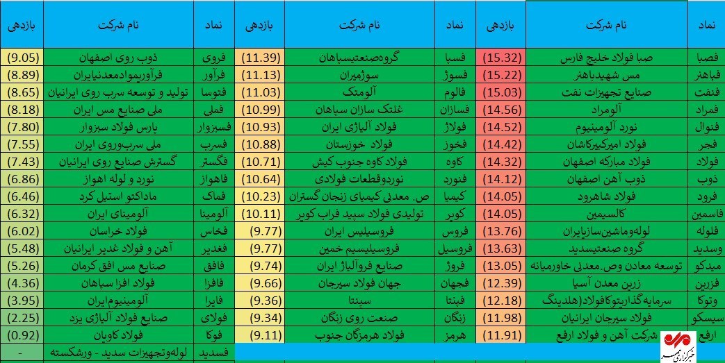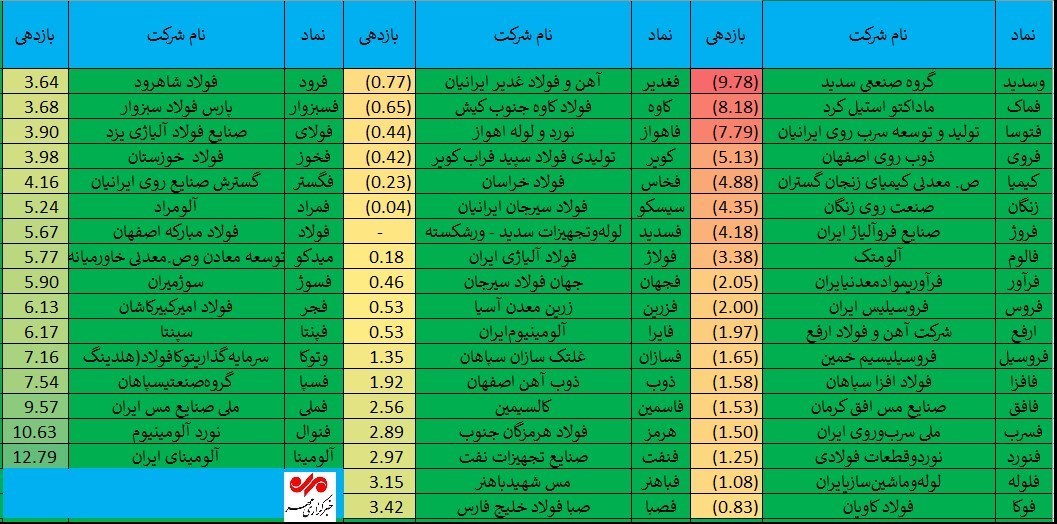 جدول زیر بازدهی نمادهای مختلف صنعت فلزات اساسی را در بازه 7 تا 18 تیر نشان میدهد.