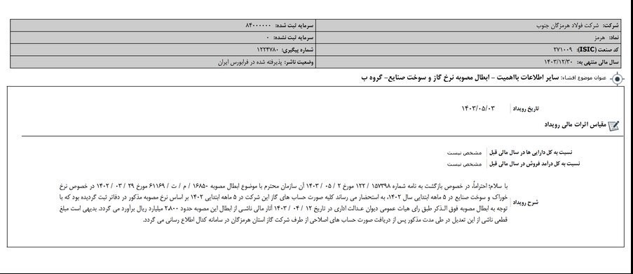 عصر بازار- به دنبال انتشار گزارش شرکت مجتمع فولاد خراسان، امروز نیز فولاد هرمزگان جنوب، گزارش شفاف سازی خود را روی سامانه کدال منتشر کرد.