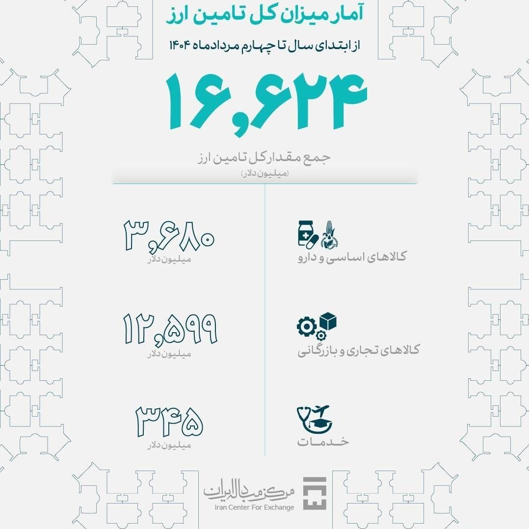 عصر بازار- از ابتدای سال ۱۴۰۴ تا چهارم مرداد ماه، ۱۶ میلیارد و ۶۲۴ میلیون دلار از سوی بانک مرکزی برای واردات کالاهای اساسی و دارو، صنایع و نیازهای خدماتی تامین ارز شده است.