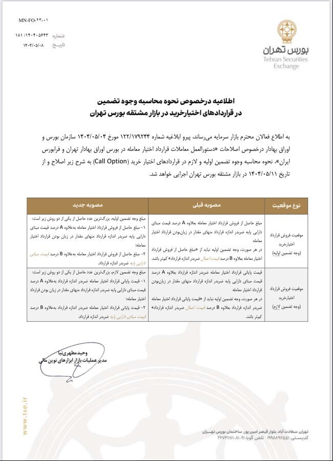 به گزارش پایگاه خبری «عصر بازار» به نقل از سنا، در اطلاعیه بورس تهران آمده است: پیرو ابلاغیه شماره 122/179244 تاریخ 4 مرداد سازمان بورس برای اصلاحات « دستورالعمل معاملات قرارداد اختیار معامله در بورس تهران و فرابورس، نحوه محاسبه وجوه تضمین اولیه و لازم در قراردادهای اختیار خرید اصلاح و از 11 مرداد در بازار مشتقه بورس تهران اجرا میشود.
