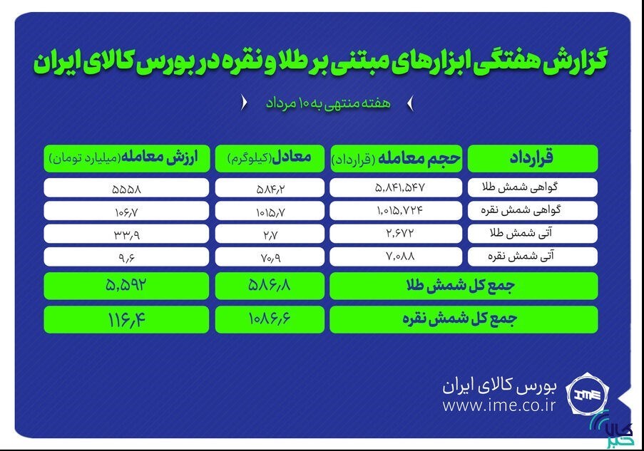 به این ترتیب در هفته گذشته در مجموع 1086.6 کیلوگرم شمش نقره به ارزش حدود 116.4 میلیارد تومان و 586.8 کیلوگرم شمش طلا به ارزش 5،558 میلیارد تومان در بورس کالا منعقد شد.