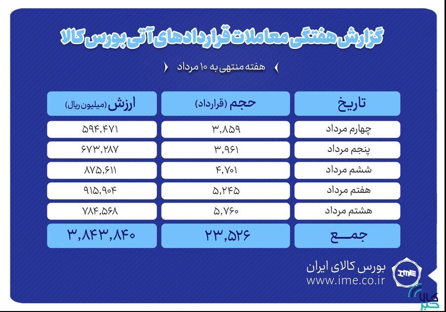 به گزارش پایگاه خبری «عصر بازار» به نقل از کالاخبر ،در هفته گذشته 23 هزار و 526 قراردادآتی به ارزش بالغ بر 384 میلیارد تومان منعقد شد.در هفته گذشته بیشترین ارزش معامله به روز 7 مرداد ماه اختصاص یافت به طوری که در این روز 5 هزار و 245 قرارداد منعقد شد و ارزش معاملات نیزبه 91 میلیارد تومان رسید.