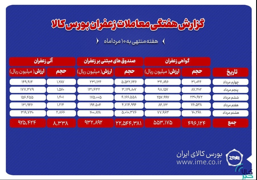 عصر بازار- گزارش هفتگی معاملات زعفران نشان میدهد که در هفته منتهی به ۱۰ مرداد ماه معادل ۸۳۴ کیلوگرم زعفران نگین به ارزش حدود ۹۳.۵ میلیارد تومان در بازار آتی بورس کالا داد و ستد شد.