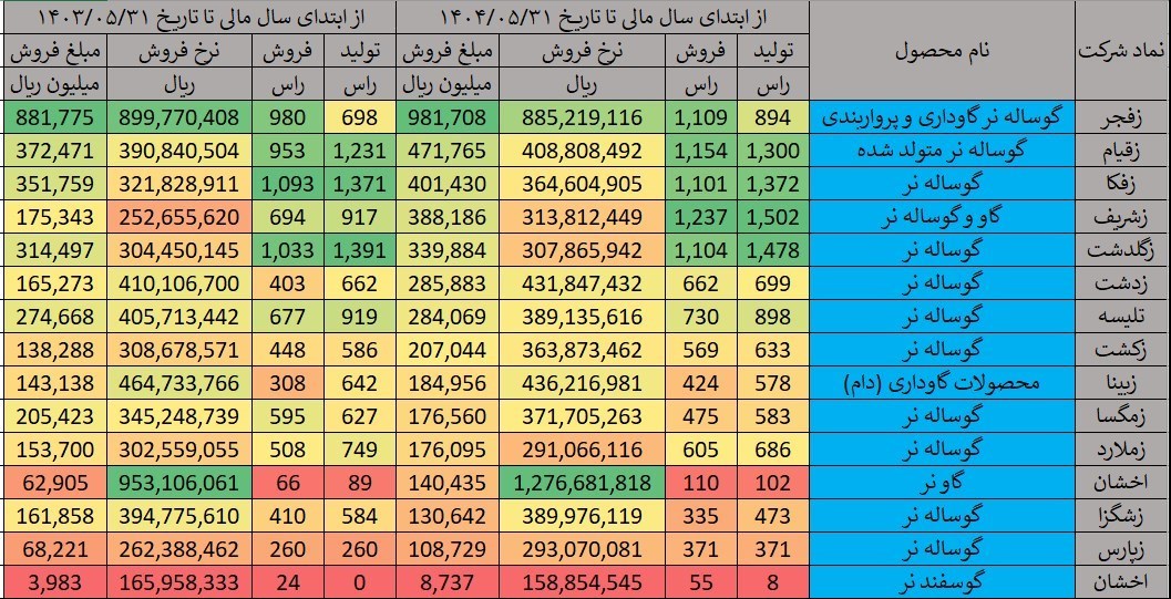 این ارقام نشان میدهد که در مدت 5 ماه نخست امسال، بیشتر شرکتهای گروه دامپروری بورسی توانستهاند تعداد تولید و فروش و همچنین درآمد خود را در محصول گاو و گوساله نسبت به مدت مشابه سال قبل افزایش دهند، هرچند شدت و دامنه این رشد در میان شرکتها متفاوت بوده است.