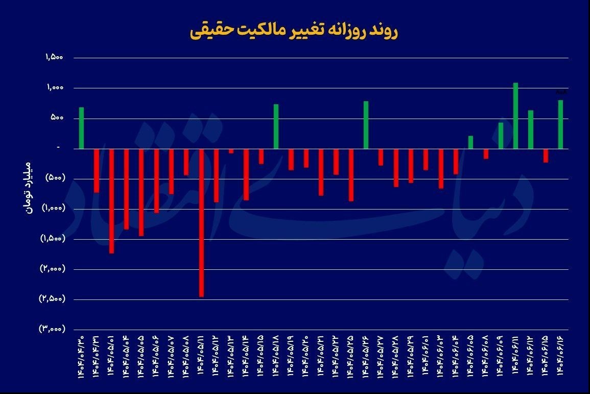 بازار سهام در دومین روز هفته شاهد صحنهای از استقبال حقیقیها بود. ورود پول حقیقی به معاملات سهام، حق تقدم و صندوقهای سهامی بیش از 854میلیارد تومان بود. با این حال، صندوقهای طلا با جذب بیش از 600میلیارد تومان صدرنشین ورود پول حقیقی بودند و پس از آن صندوقهای سهامی قرار دارند که موفق شدند تا بیش از 400میلیارد تومان را جذب بازار کنند. ارزندگی بالای نمادهای شیمیایی و فرآوردههای نفتی همزمان با بهبود کرک اسپرد و افزایش قیمت دلار، شرایطی را فراهم آورد تا رشد بازار سهام با محوریت این دو صنعت به وقوع بپیوندد. از سوی دیگر صنایع انبوهسازی، سیمان و زراعت در قعر جدول ورود پول قرار دارند. صندوقهای درآمد ثابت نیز خروج 750میلیارد تومانی را به ثبت رساندند.