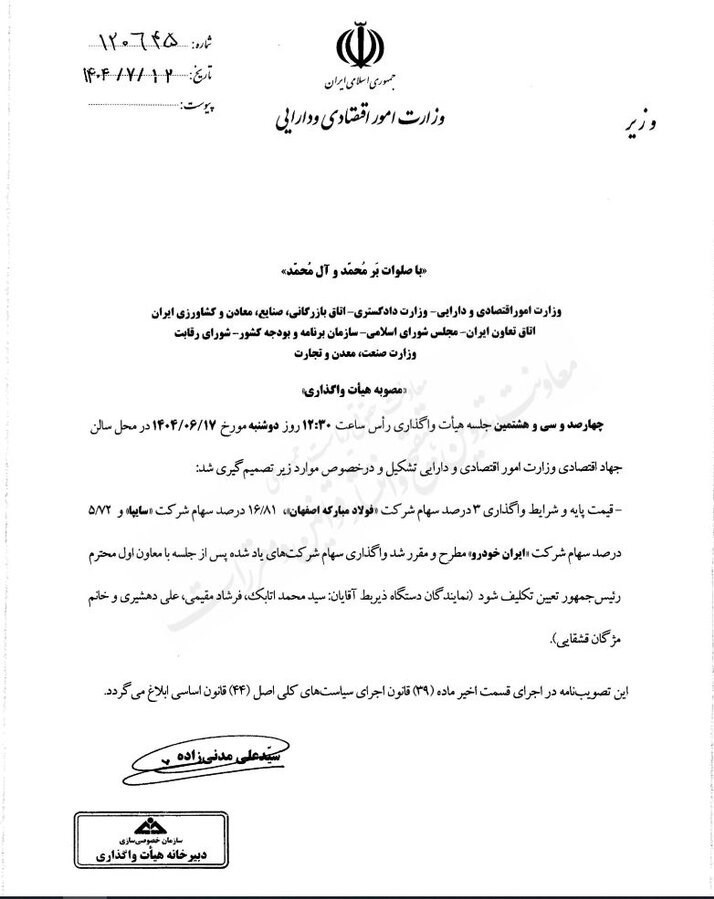 در این جلسه، درباره قیمت پایه و شریط واگذاری شرکتهای « فولاد مبارکه اصفهان، سایپا و ایران خودرو» تصمیمگیری شد.