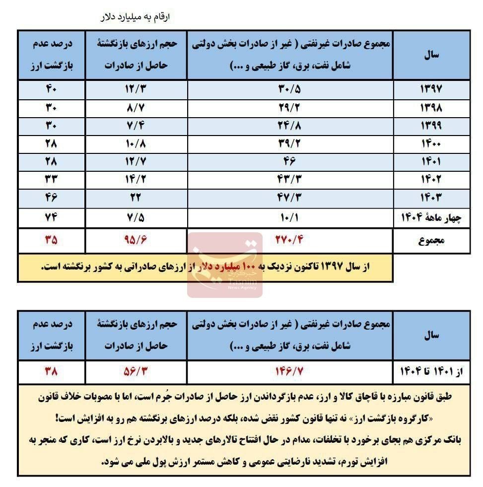 بر اساس آمار رسمی منتشرشده، از سال 1397 تاکنون حدود 270 میلیارد دلار صادرات غیرنفتی (بهجز صادرات بخش دولتی شامل نفت، برق، گاز طبیعی و…) انجام شده که از این میزان، حدود 95 میلیارد دلار آن، معادل 35 درصد کل صادرات، به چرخه رسمی کشور بازنگشته است.