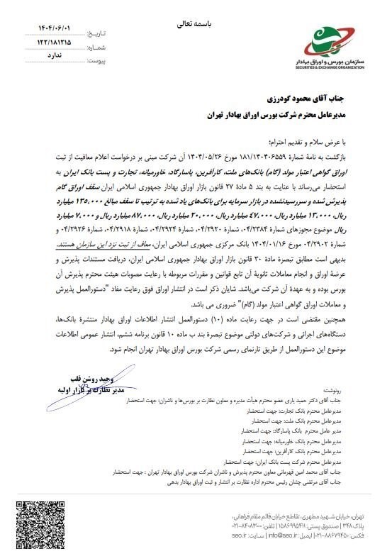 به گزارش پایگاه خبری «عصربازار» به نقل از سنا، مدیریت پذیرش بورس تهران اعلام کرد: با توجه به موافقت هیئت پذیرش بورس تهران در جلسه 12 خرداد امسال با پذیرش اوراق گواهی اعتبار مولد (گام) بانک ملت در بورس تهران از 6 آبان، مبلغ 250 میلیارد ریال اوراق گام با سررسید 31 شهریور 1405با نماد « اگ050612» در بازار اوراق بدهی بورس تهران درج شد.