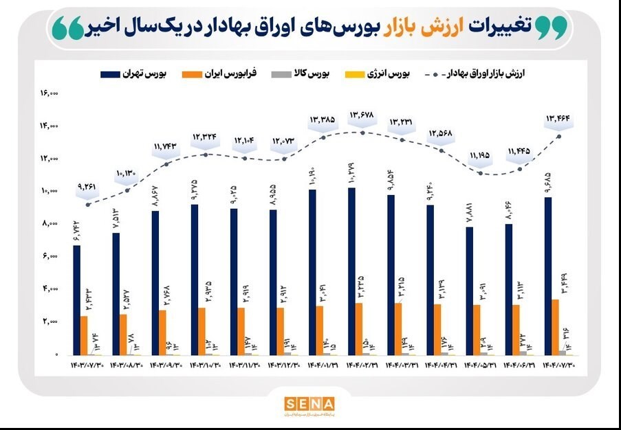 عصر بازار- دادههای آماری گزارش مدیریت پژوهش، توسعه و مطالعات اسلامی سازمان بورس و اوراق بهادار از روند یکساله ارزش بازار اوراق بهادار در ۴ بورس فعال ایران نشان میدهد مجموع ارزش بازارهای اوراق بهادار در بورس تهران، فرابورس ایران، بورس انرژی و بورس کالا در پایان مهر امسال به بیش از ۱۳،۴۶۴ هزارمیلیارد تومان رسید.