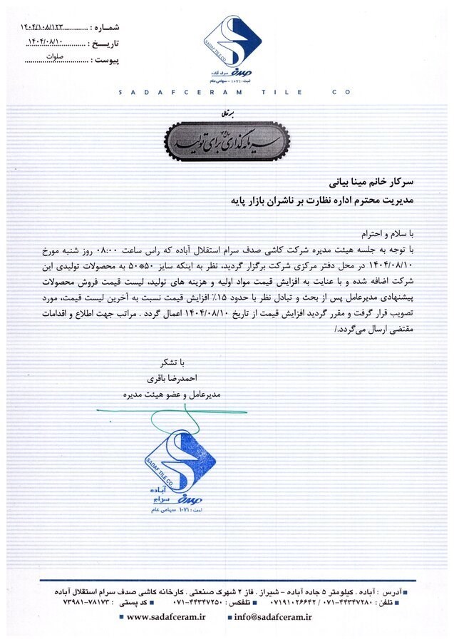 شرکت کاشی صدف سرام استقلال آباده با نماد«کصدف» در اطلاعیه افشای اطلاعات بااهمیت گروه الف از افزایش 15درصدی نرخ فروش محصولات تولیدی 50*50 و 60*60 و 60*120 خبر داد.
