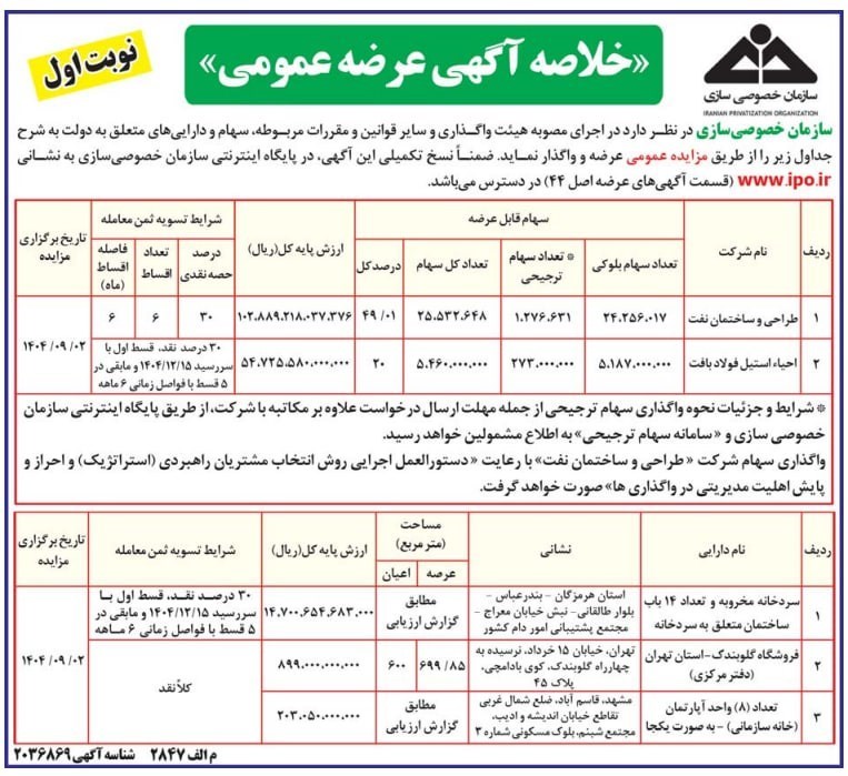 عصر بازار- سازمان خصوصی‌سازی بخشی از سهام دو شرکت نفتی و فولادی را با قیمت پایه در مجموع ۱۵.۶ همت برای فروش از طریق مزایده عمومی، در نشریات آگهی کرده است.