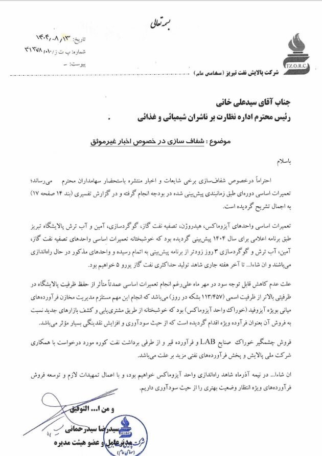 به گزارش پایگاه خبری «عصر بازار» به نقل از سنا، سیدرضا سیدرحمانی مدیر عامل شرکت پالایش نفت تبریز در نامهای به سید علی خانی رییس اداره نظارت بر ناشران شیمیایی و غذایی سازمان بورس از پایان تعمیرات اساسی در سامانه کدال خبر داد و نوشت:« تعمیرات اساسی دورهای طبق زمانبندی پیشبینی شده در بودجه انجام شده و در گزارش تفسیری تشریح شده است.»