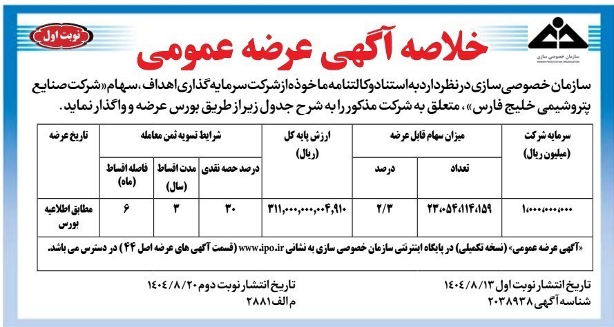 عصر بازار- سازمان خصوصی سازی در نظر دارد به استناد وکالت‌نامه ماًخوذه از شرکت سرمایه گذاری اهداف، ۲/۳ درصد از سهام «شرکت صنایع پتروشیمی خلیج فارس»، متعلق به شرکت مذکور را از طریق بورس عرضه و واگذار نماید.