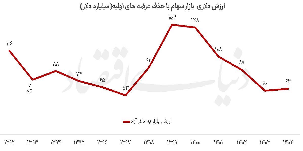 علی اسکینی، کارشناس بازار سرمایه به ارزیابی وضعیت دلاری بازار سهام پرداخت: ارزش فعلی بازار سرمایه حدود 100‌میلیارد دلار است. در صورتی که عرضه‌های اولیه‌ای که از سال 92 وارد بازار سهام شدند را حذف کنیم، این ارزش بازار به 60‌میلیارد دلار می‌رسد. زمانی که این مقدار با روند تاریخی مقایسه می‌شود، با توجه به اینکه میانگین ارزش بازار در دوره‌های مختلف حدود 150‌میلیارد دلار بوده و با حذف ارزش عرضه‌های اولیه، معمولا بین 80 تا 100‌میلیارد دلار در نوسان بوده است، بنابراین در مقایسه تاریخی، می‌توان گفت بازار همچنان از میانگین ارزش واقعی خود عقب است.