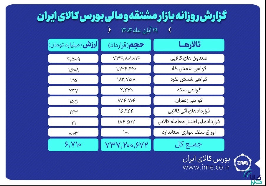 همچنین در معاملات روزگذشته بازار مشتقه و مالی، 734 میلیون و 801 هزار و 14 واحد صندوق کالایی به ارزش 4 هزار و 509 میلیارد تومان دست به دست شد.