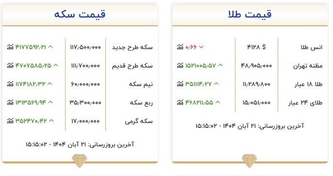 به گزارش پایگاه خبری «عصر بازار» به نقل از ایرنا، اتحادیه طلا و جواهر تهران روز چهارشنبه (21 آبان ماه) بهای هر اونس طلای جهانی را چهار هزار و 128 دلار اعلام کرد که نسبت به روز گذشته تغییری نداشت؛ بر این اساس و تا لحظه درج این خبر بهای هر گرم طلای 18 عیار با رشد 351 هزار و 114 تومانی، 11 میلیون و 289 هزار و 800 تومان و هر گرم طلای 24 عیار 468 هزار و 211 تومان افزایش داشت و به 15 میلیون و 51 هزار تومان رسید.