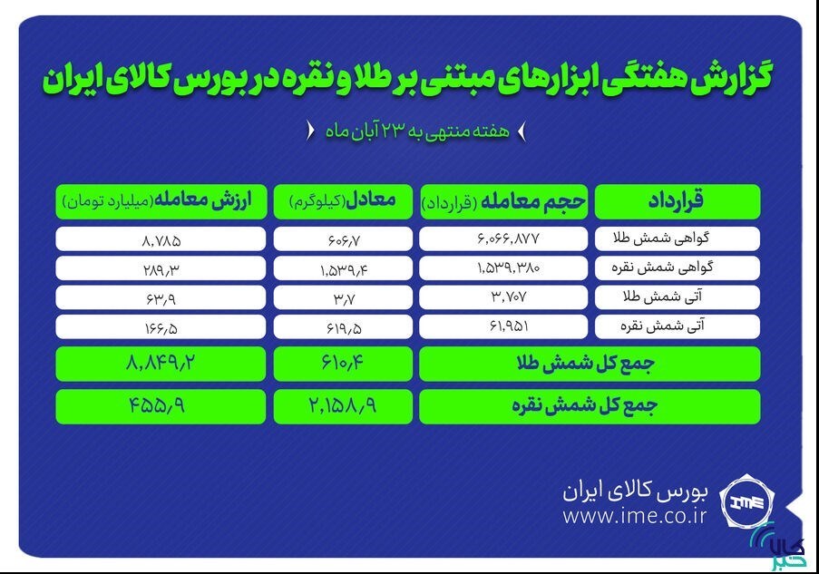 به گزارش پایگاه خبری «عصر بازار» به نقل از کالاخبر ،بررسی روند معاملات شمش نقره در بورس کالا نشان می‌دهد که در هفته منتهی به 23 آبان، یک میلیون و 539 هزار و 380 گواهی سپرده معادل 1539.4 کیلوگرم شمش نقره به ارزش 289.3 میلیارد تومان و 61 هزار و 951 قرارداد آتی معادل 619.5 کیلوگرم شمش نقره به ارزش 166.5 میلیارد تومان منعقد شد.