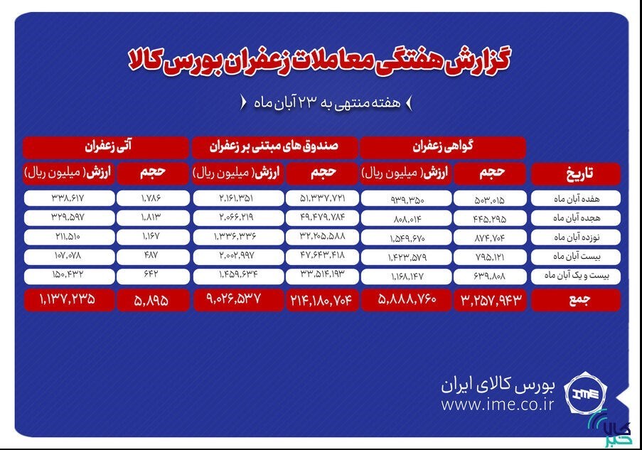 عصر بازار- گزارش هفتگی معاملات زعفران نشان می‌دهد که در هفته منتهی به ۲۳ آبان ۵۹۰ کیلوگرم زعفران نگین به ارزش ۱۱۳.۷ میلیارد تومان در بازار آتی بورس کالا داد و ستد شد.