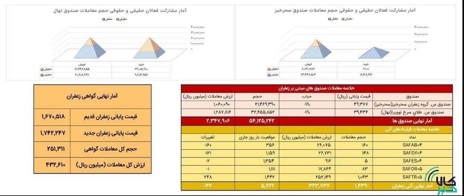 بر اساس آمارهای روز گذشته بازار زعفران، حجم معاملات صندوقهای مبتنی بر زعفران به 54 میلیون و 125 هزار و 242 واحد به ارزش معاملات 234.8 میلیارد تومان رسید. میزان مشارکت فعالان حقیقی در حجم معاملات صندوق سحرخیز، در خرید 52 درصد و در فروش 63 درصد بود. این مشارکت برای صندوق نهال نیز برای خرید و فروش به ترتیب 29 و 62 درصد بود.
