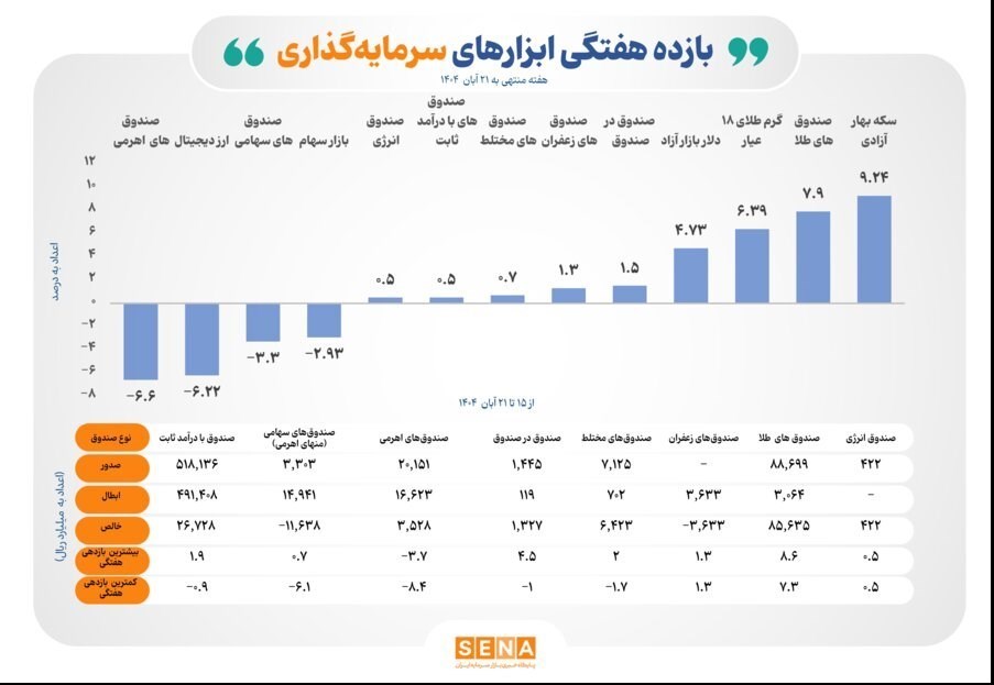 عصر بازار- طبق اطلاعات و دادههای مرکز نظارت بر صندوقهای سرمایهگذاری سازمان بورس و اوراق بهادار، در بازه زمانی ۱۵ تا ۲۱ آبان ۱۴۰۴، بازده ۶ ابزارهای سرمایهگذاری بورس مثبت بوده است.
