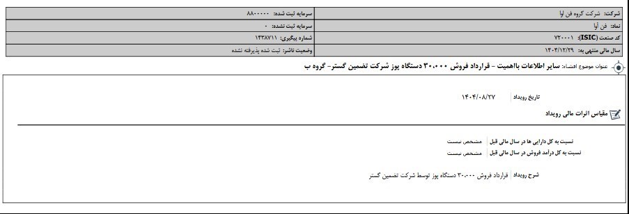 شرکت گروه فن‌ آوا با نماد«فن‌ آوا» در اطلاعیه افشای اطلاعات بااهمیت گروه ب از قرارداد فروش 30،000 دستگاه پوز توسط شرکت تضمین گستر خبر داد.