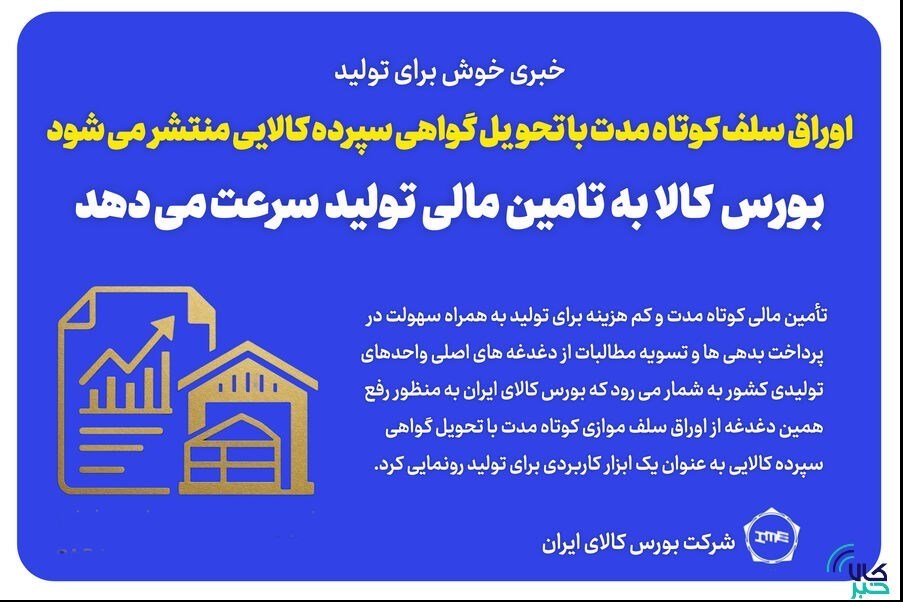 عصر بازار- تأمین مالی کوتاه‌مدت و کم هزینه برای تولید به همراه سهولت در پرداخت بدهی‌ها و تسویه مطالبات از دغدغه های اصلی واحدهای تولیدی کشور به شمار می رود که بورس کالای ایران به منظور رفع همین دغدغه از اوراق سلف موازی کوتاه مدت با تحویل گواهی سپرده کالایی به عنوان یک ابزار کاربردی برای تولید رونمایی کرد.