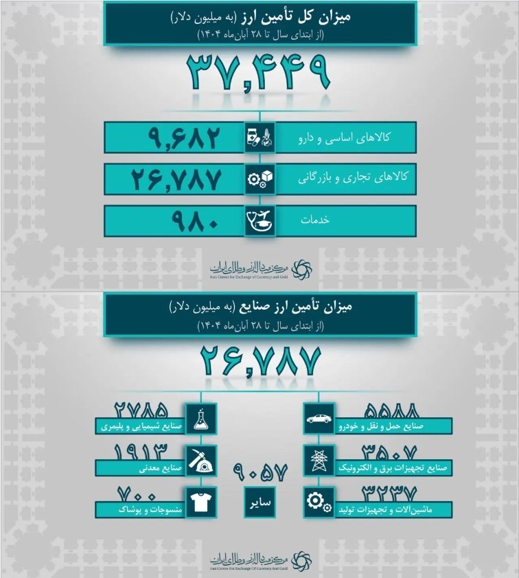 به گزارش پایگاه خبری «عصر بازار» به نقل از ایبنا، از ابتدای سال جاری تا 28 آبانماه، بیش از 37 میلیارد و 449 میلیون دلار ارز برای واردات انواع کالاهای اساسی، دارو، محصولات صنعتی و خدمات توسط بانک مرکزی تامین شده است.