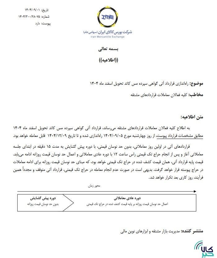 به گزارش پایگاه خبری «عصر بازار» به نقل از کالاخبر ،بر اساس اعلام مدیریت بازار مشتقه و ابزارهای نوین مالی بورس کالا، قراردادهای آتی در اولین روز معاملاتی، بدون حد نوسان قیمتی، با دوره پیش گشایش به مدت ١٥ دقیقه در ابتدای جلسه معاملاتی آغاز و پس از انجام حراج تک قیمتی راس ساعت ١٢ با دوره عادی معاملاتی و اعمال حد نوسان قیمت روزانه ادامه می یابد.