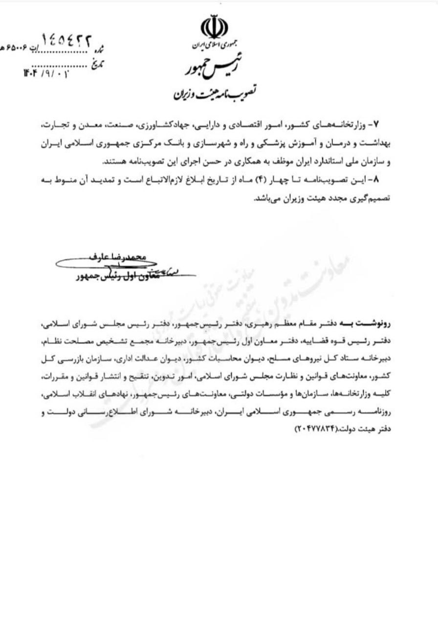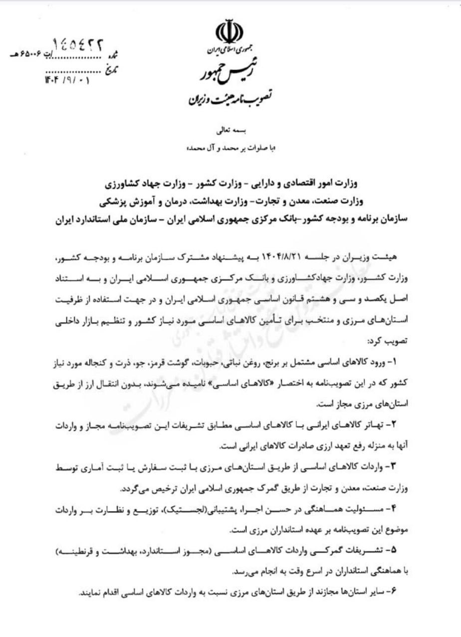 به گزارش پایگاه خبری «عصر بازار» به نقل از تسنیم، هیئت وزیران در جلسه مورخ 21 آبان 1404 و بنا به پیشنهاد مشترک سازمان برنامه و بودجه کشور، وزارت کشور، وزارت جهاد کشاورزی و بانک مرکزی جمهوری اسلامی ایران، و به استناد اصل 138 قانون اساسی، مصوبه مهمی را در راستای استفاده از ظرفیت استان‌های مرزی برای تأمین کالاهای اساسی کشور و تنظیم بازار داخلی به تصویب رساند.