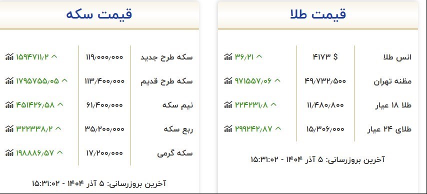 به گزارش پایگاه خبری «عصر بازار» به نقل از ایرنا، اتحادیه طلا و جواهر تهران برای روز چهارشنبه پنجم آذر بهای هر اونس طلا را 4 هزار و 173 دلار اعلام کرد که 36 دلار و 21 سنت نسبت به روز گذشته افزایش داشت و به همین دلیل بهای هر گرم طلای 18 عیار 11 میلیون و 480 هزار و 800 تومان و هر گرم طلای 24 عیار 15 میلیون و 306 هزار تومان قیمت گذاری شدند که در طلای 18 عیار حدود 224 هزار تومان و در طلای 24 عیار حدود 299 هزار تومان رشد قیمت ثبت شد.