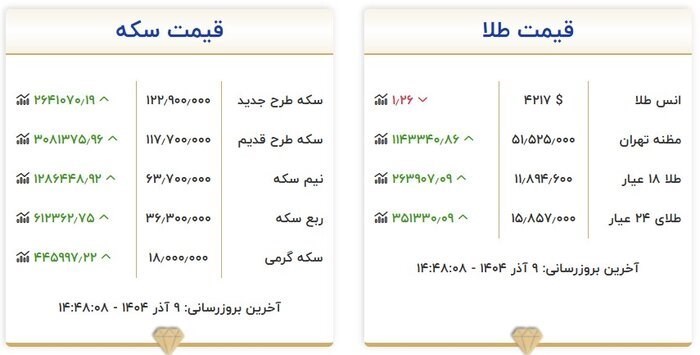 در بازار مسکوکات طلا نیز نرخ ها افزایشی بود، به طوری که هر قطعه سکه تمام با افزایش 2 میلیون و 641 هزار و 70 تومانی به قیمت 122 میلیون و 900 هزار تومان فروخته شد و سکه تمام طرح قدیم نیز با افزایش سه میلیون و 81 هزار و 375 تومانی، 117 میلیون و 700 هزار تومان عرضه شد.